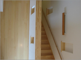 1-5.囲炉裏のある無垢材をふんだんに使った健康住宅外部柱間に高気密、高断熱を期待できるセルロースファイバーを施工しました。屋根も熱抵抗値の高いネオマフォームの2重垂木通気工法とし、内部は無垢材、珪藻土をふんだんに使用しています。囲炉裏のある吹き抜けリビング上部の梁を隠さずに排気ダクトとしました。外部のウッドデッキは耐久性、対候性のあるウリン材を使用しています。